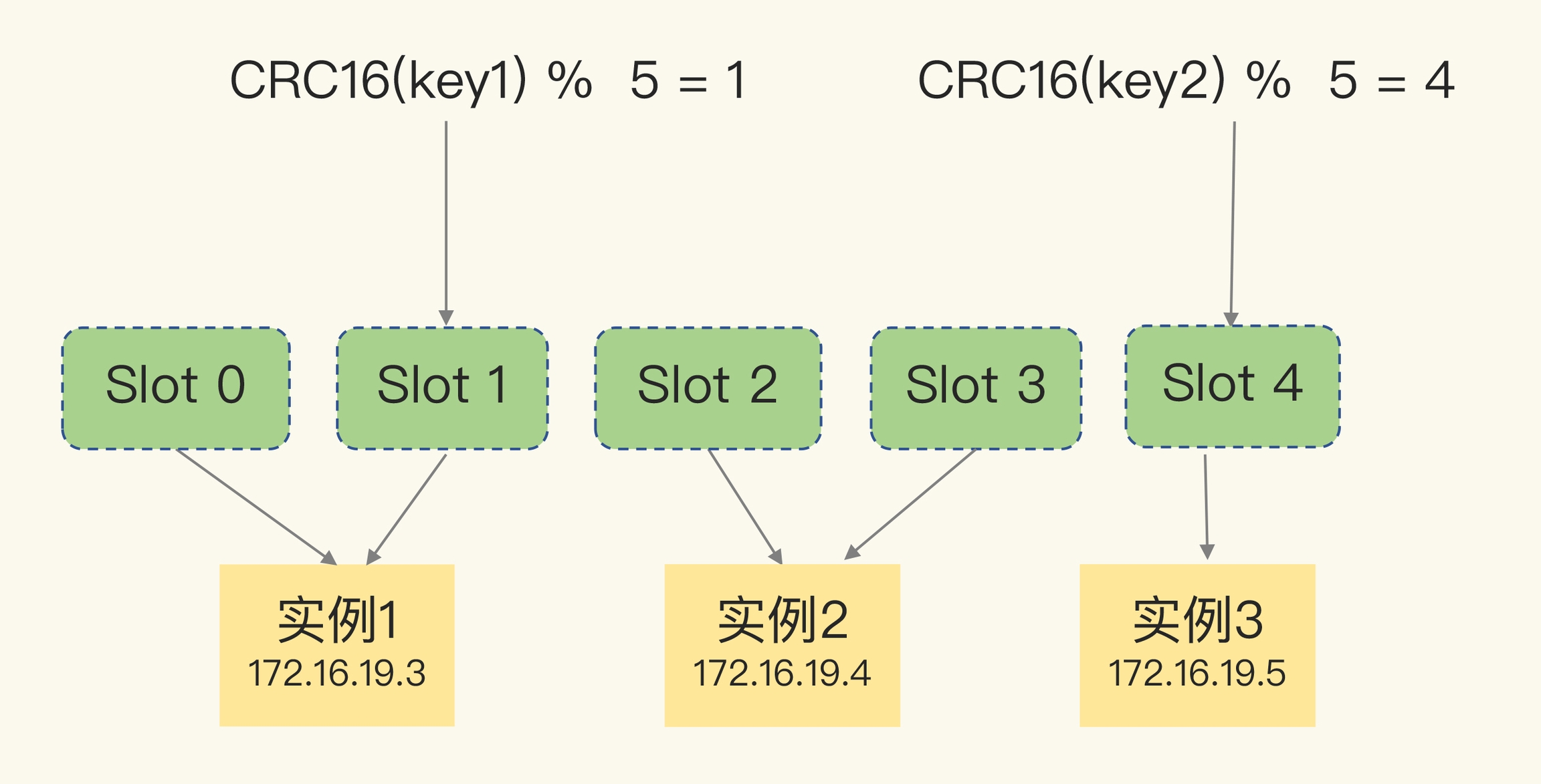 在集群运行的过程中,key1和key2计算完CRC16值后,对哈希槽总个数5取模,再根据各自的模数结果,就可以被映射到对应的实例1和实例3上了。