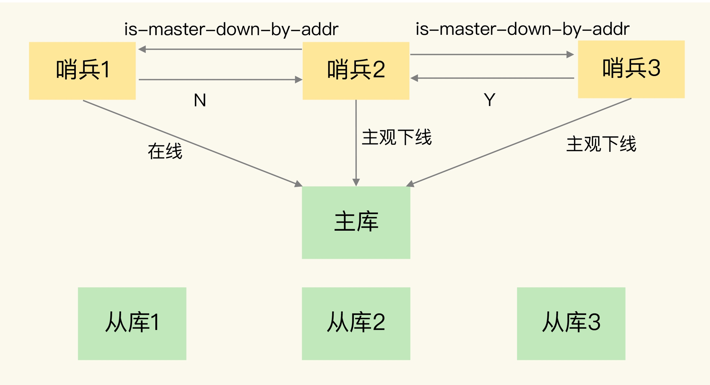 任何一个实例只要自身判断主库“主观下线”后,就会给其他实例发送is-master-down-by-addr命令。接着,其他实例会根据自己和主库的连接情况,做出Y或N的响应,Y相当于赞成票,N相当于反对票。