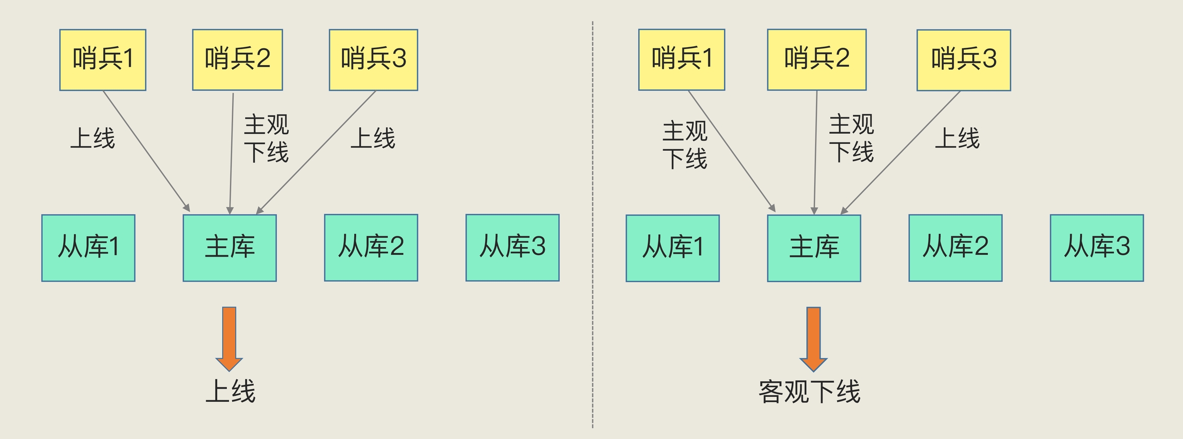如下图所示,Redis主从集群有一个主库、三个从库,还有三个哨兵实例。在图片的左边,哨兵2判断主库为“主观下线”,但哨兵1和3却判定主库是上线状态,此时,主库仍然被判断为处于上线状态。在图片的右边,哨兵1和2都判断主库为“主观下线”,此时,即使哨兵3仍然判断主库为上线状态,主库也被标记为“客观下线”了。