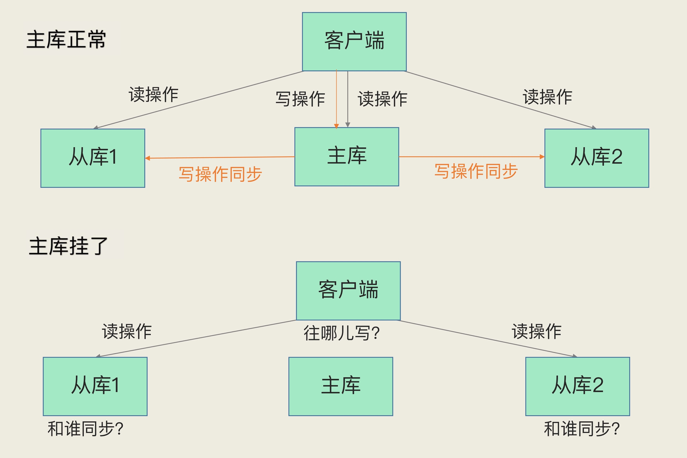 上节课,我们学习了主从库集群模式。在这个模式下,如果从库发生故障了,客户端可以继续向主库或其他从库发送请求,进行相关的操作,但是如果主库发生故障了,那就直接会影响到从库的同步,因为从库没有相应的主库可以进行数据复制操作了。
