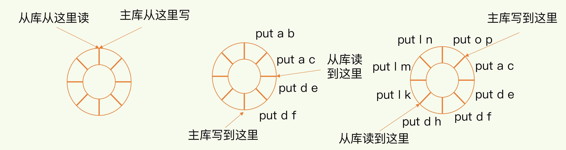 就像刚刚示意图的中间部分,主库和从库之间相差了put d e和put d f两个操作,在增量复制时,主库只需要把它们同步给从库,就行了。