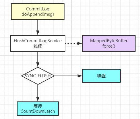 刷盘的最终实现都是使用NIO中的 MappedByteBuffer.force() 将映射区的数据写入到磁盘,如果是同步刷盘的话,在Broker把消息写到CommitLog映射区后,就会等待写入完成。