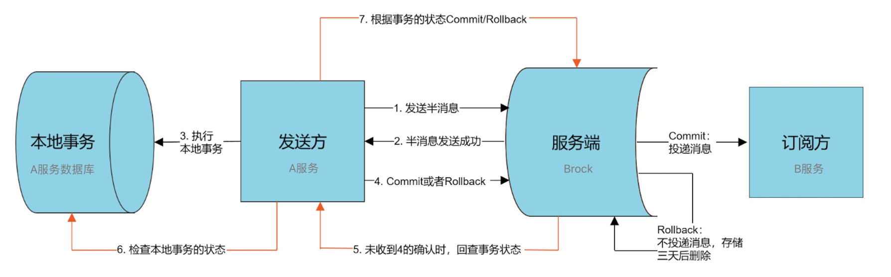 如果本地事务成功,那么Product像Brock服务器发送Commit,这样B服务就可以消费该message。