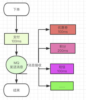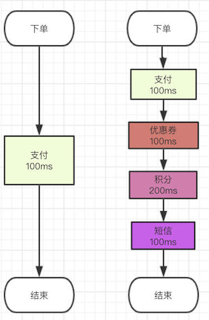 那链路长了就慢了,但是我们发现上面的流程其实可以同时做的呀,你支付成功后,我去校验优惠券的同时我可以去增减积分啊,还可以同时发个短信啊。